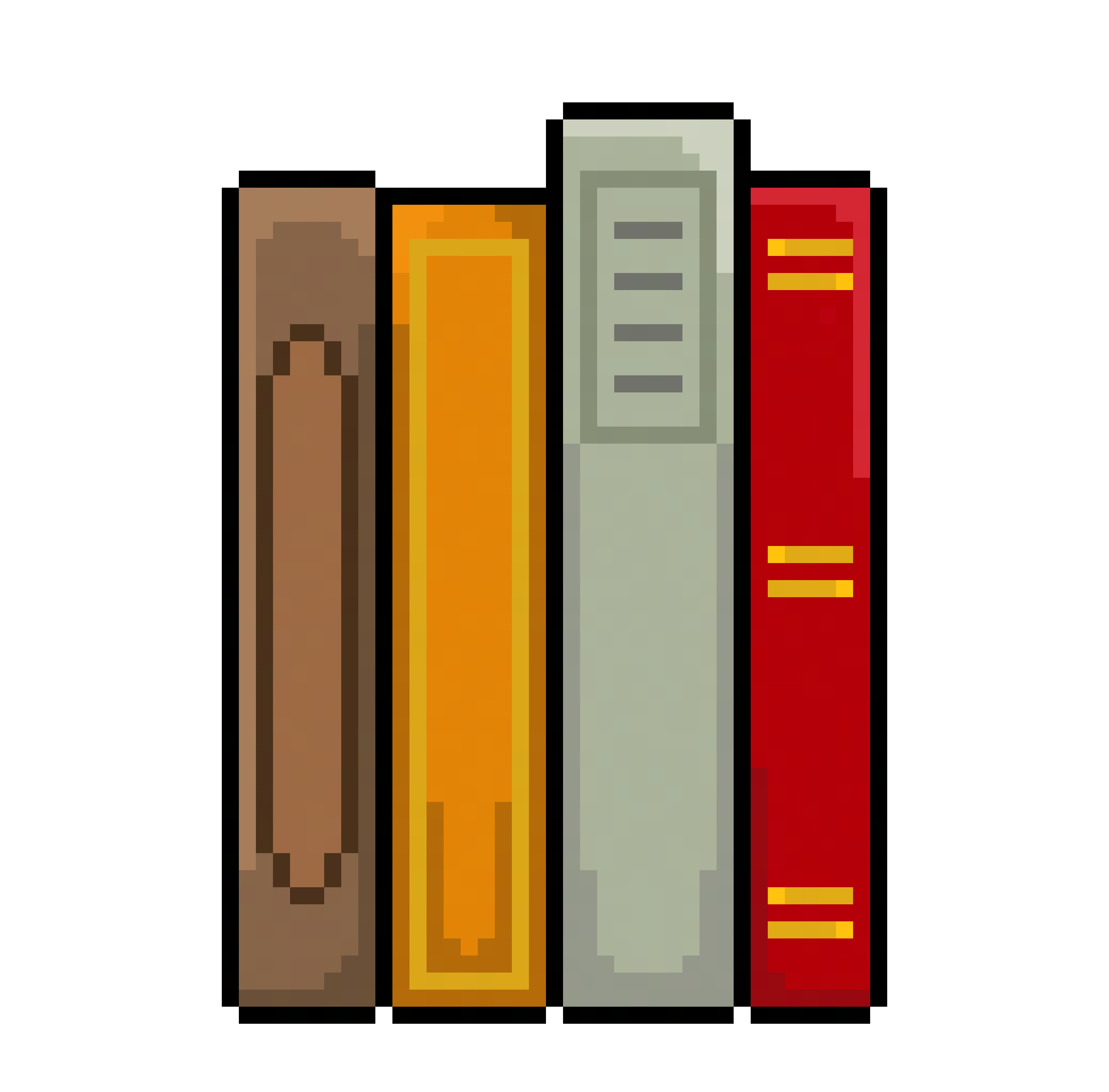 A 64×64 retro 8-bit pixel art of four books arranged in a row, displaying their back covers. Free PNG download with transparent background.