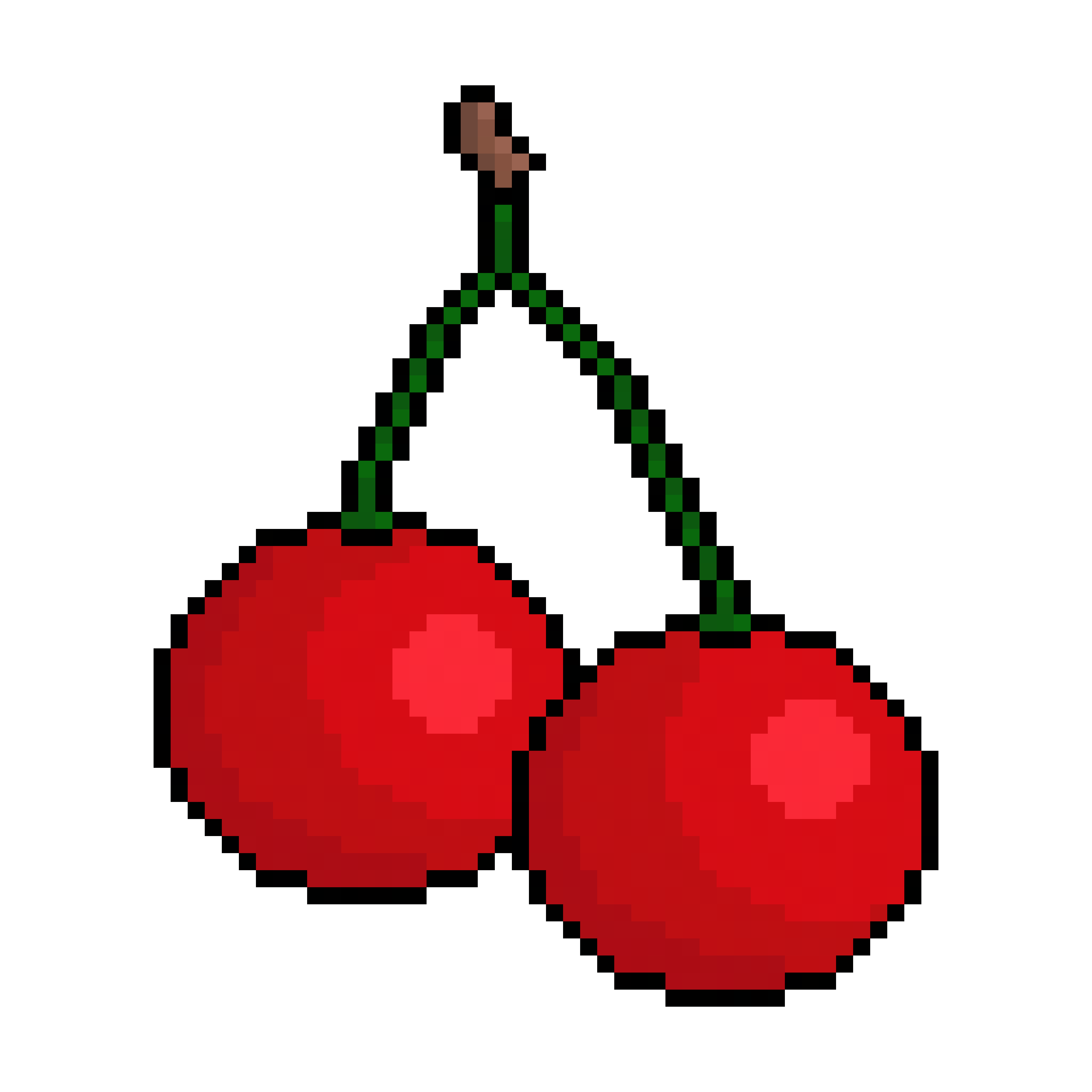 This image features pixel art of a pair of red cherries connected by a green stem. The artwork is created on a 64×64 canvas in a classic 8-bit style. The downloadable resource is a free, background-free PNG that doesn’t require attribution and can be used for personal projects such as wedsites, apps, or social media videos.