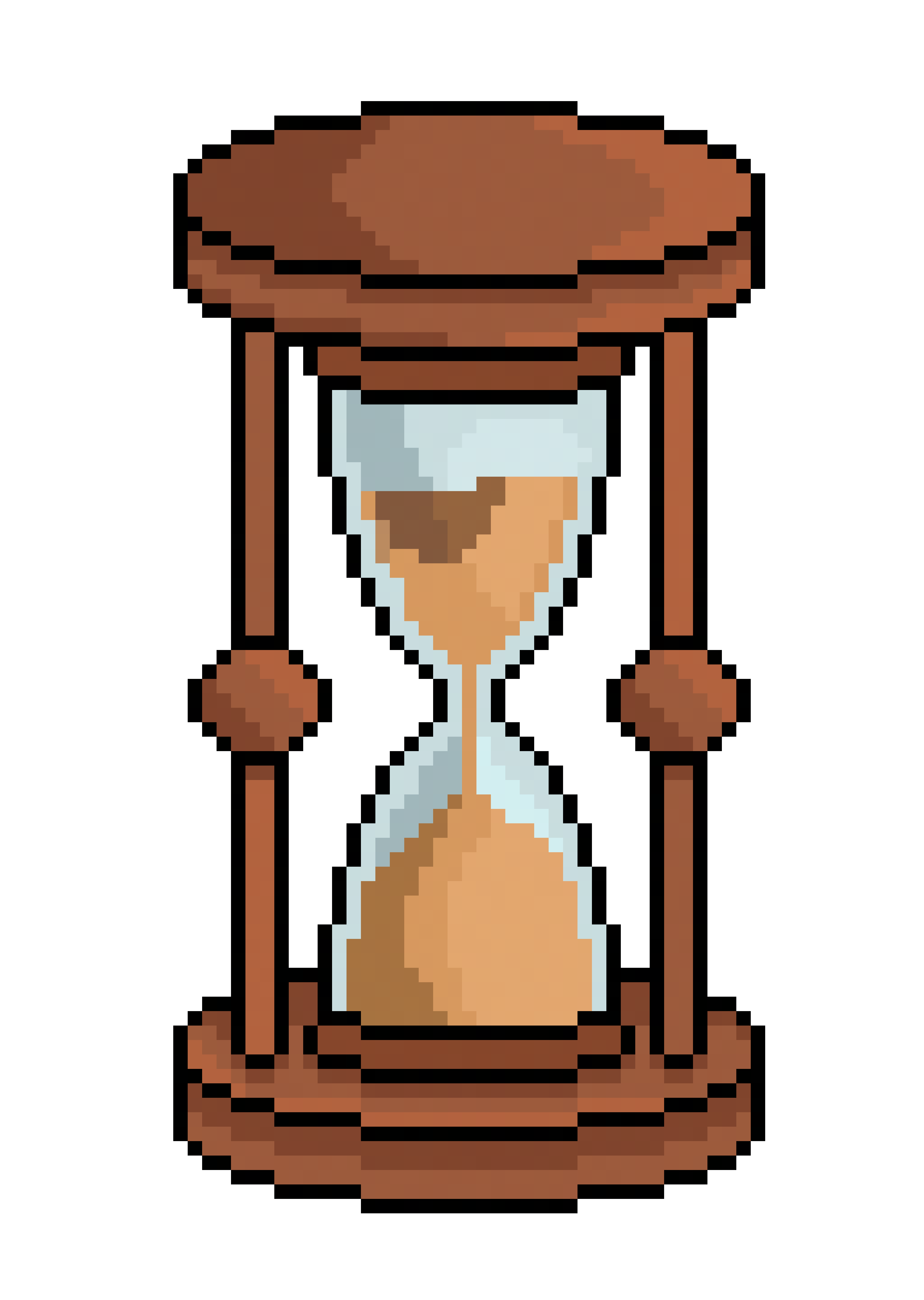 A 64×64 retro 8-bit pixel art of an hourglass with a wooden frame, available as a free downloadable PNG with transparent background.